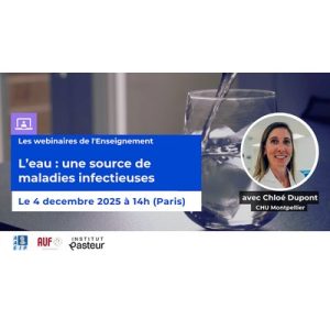 Webinaire Institut Pasteur "L’eau : une source de maladies infectieuses" Jeudi 4 décembre 2025 à 14h (heure de Paris) Dans le cadre des Webinaires de ...